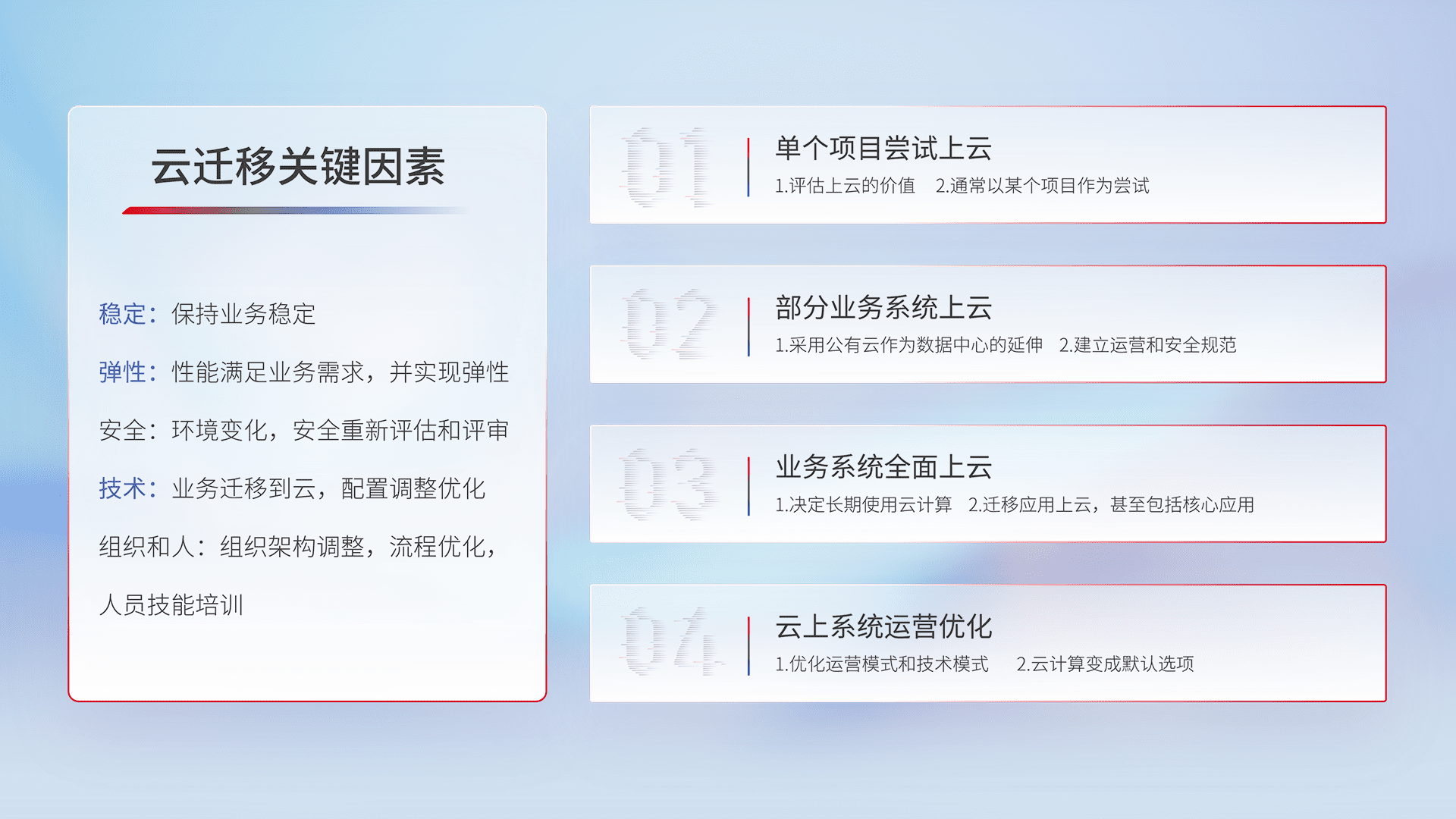 结合实际业务,,,,从规划设计、、云平台选型、、、、云原生改造、、数据迁移、、、集成交付,,迁移全过程为客户识别最佳上云路径,,做好风险识别管理,,,,设计网络架构、、、、身份权限、、、安全审计合规、、、操作审计、、日志审计、、监控告警策略、、、多站点容灾设计等,,,,对云上基础设施进行整体规划,,,提升IT治理水平,,以满足弹性、、、、高可用、、、、高性能的需求。。