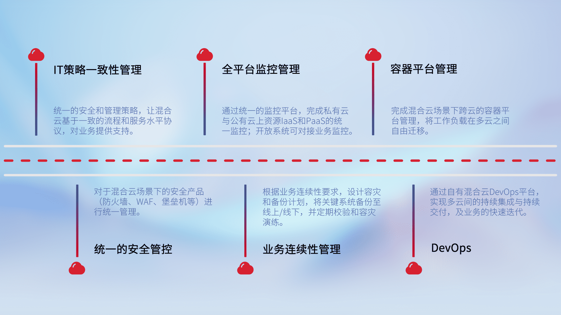 通过多云纳管,,,,以统一的资源数据模型把客户的云资源进行抽象和封装,,,,进而实现对多云资源的统一操作,,,保障云资源管理的可靠性、、稳定性与可用性。。。量身定制化运维内容,,配置、、开发运维、、、、补丁管理、、、、备份、、、监控、、、、认证和访问管理、、审计和日常巡检等,,,保障在用云过程中的可靠度,,稳定度以及高可用率。。。。